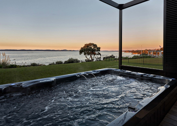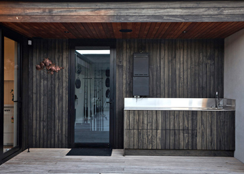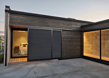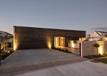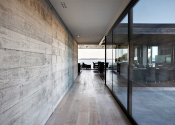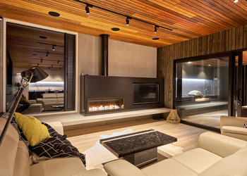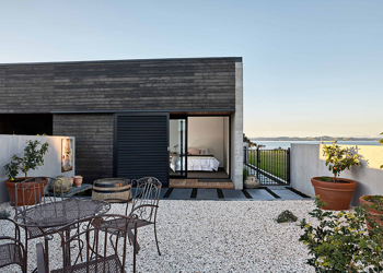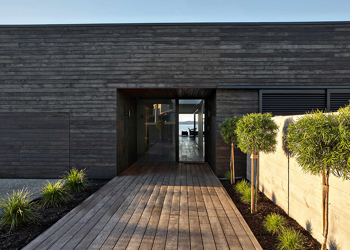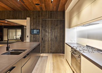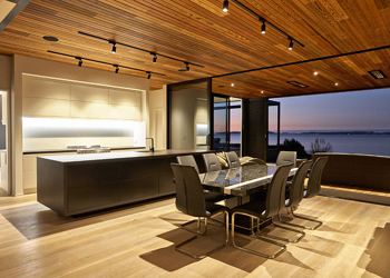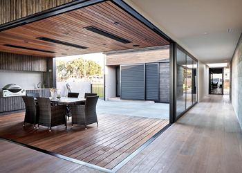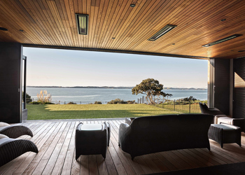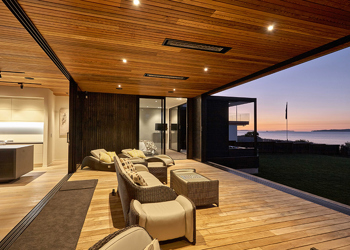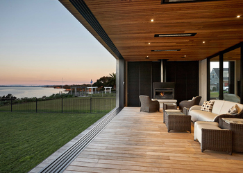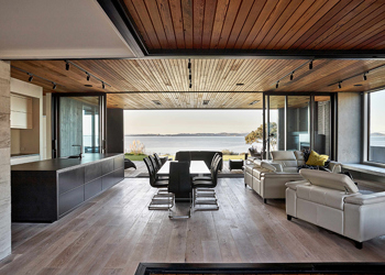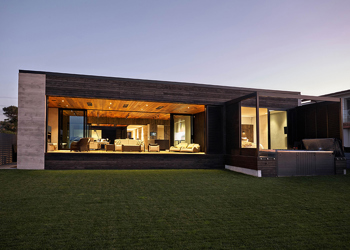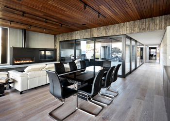 This beautiful home with breathtaking views was designed for outdoor enjoyment all year-round. Smart design creates several contained exterior spaces, with timber ceilings flowing into private, sheltered courtyard areas. The home’s construction is a mix of materials. The exterior features huge panes of glass framed by concrete-tilt panel and Accoya timber cladding. The overall effect is simple and elegant, creating a form that blends seamlessly with the landscape.