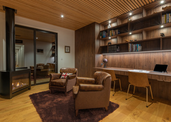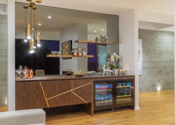 The first glimpse of the house gives an understanding of the challenge they faced. A four-metre graduated retaining wall circles dwelling and driveway, and sets the stage for the main event. However, simplicity reigns once you enter the home. The concrete anchors the rear of a linear footprint that comprises a centralised living zone that separates two bedroom wings - one for the homeowners and one for guests. It's contemporary, calm and exquisitely decked out. The kitchen is pared back, yet luxurious, with a wall of glossy white cabinetry with no handles being the backdrop to the dark-stained island which is topped in Iranian onyx and lit from below so that it seems to float in space. Adjacent to this, the bar is the epitome of glamour with suspended brass shelving, oblique brass detailing in the cabinetry and brass Lee Broom pendants all reflected in that smokey glass mirror. Cocktail hour never felt so 007.