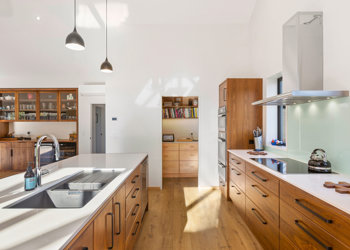 The portico connects to the light-filled kitchen. High raking ceilings intensify the space and light, contrasting with the rich timber joinery and wood floors of this picture-perfect pavilion-style home.