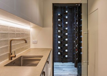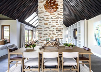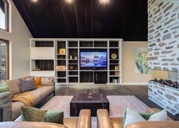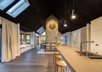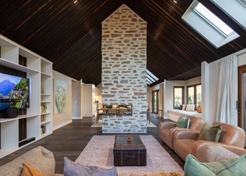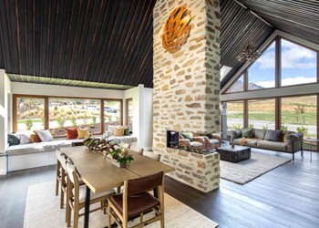The living wing enjoys unobstructed mountain views, while the dramatic timber ceiling, bagged schist fire place and custom kitchen give it a modern alpine feel. The burnt larch wall cladding in the wine cellar showcases this home’s individuality.