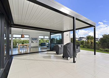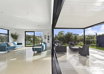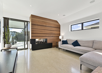 With its clean lines and crisp angles, this impressive five bedroom, three bathroom family home is a light-filled haven with generous, well-considered spaces. Polished concrete anchors the entrance and ground floor, with a floating timber tread staircase leading to carpeted living upstairs. The downstairs lounge features a horizontal cedar wall with fireplace, perfect for cosy winter evenings. The kitchen and open-plan living connect to a large tiled patio via stacker slider doors. A louvred roof allows for all-weather barbecuing and entertaining. Full-height joinery encases the kitchen, spliced by a splashback window. The extensive use of glass in this home not only aids the abundance of natural light, but also creates an intimate connection with the world outside its walls.