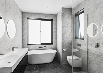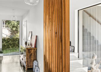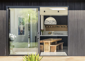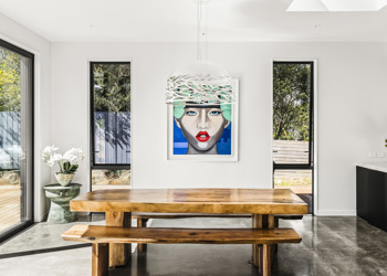Inside, there are four bedrooms, three bathrooms and two living rooms – allowing space for separation. Interior features include: a bold concrete stairwell with a screen of matai boards (rescued from the previous home), a sophisticated kitchen – complete with fingerprint-proof black cabinetry with bevelled handles, Calacatta Supreme Stone bench tops and a scullery with a coffee/bar area – and an ensuite with floor-to-ceiling Carrara marble-look tiles and concrete floor.