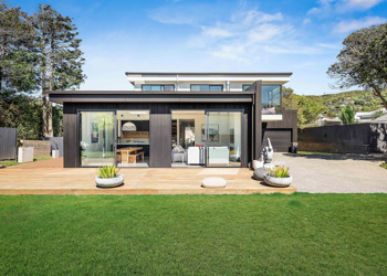 This knock down and rebuild had a house that faced the wrong way on a well established flat and sunny section. The new two-storey home is sited towards the rear of the section, so the living and outdoor areas face north.