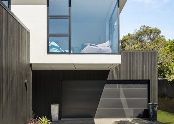 The lower level is clad in dark-stained vertically run cedar, wrapping over the north facing living areas, the garage and a blade wall that hides the living room from the driveway. The upper level is clad in crisp white plaster, and is staggered and pushed towards the rear of the site. A cantilevered section slices through one corner to hang above the entrance, sheltering it from the elements.