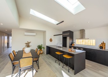This architecturally designed home combines modern style with functionality. It features an open-plan kitchen and living and dining areas enhanced by pitched ceilings and skylights that flood the space with natural light. The striking timber exterior cladding provides excellent street appeal, creating a unique and contemporary look that sets this home apart.
