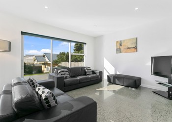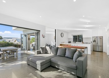 This contemporary home unfolds down the hillside as a collection of intersecting spaces with raking rooftops, following the slope of the site. The two floors with split-level portions on each storey create a dynamic living environment. The bedrooms are upstairs, while the lower level is reserved for everyday living and entertaining. Glazed bifold doors and sliders open onto the sun-soaked alfresco platform.