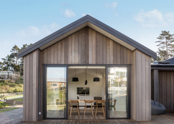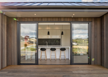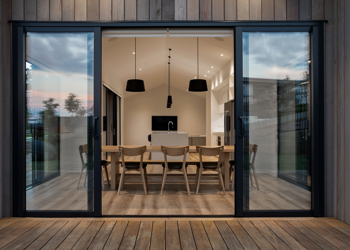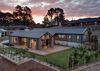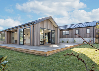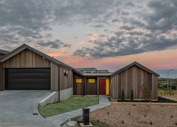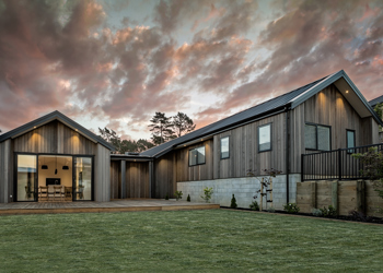 This contemporary home, built in the popular pavilion style, is clad in lightly stained vertical shiplap cedar cladding. The exterior is finished with Euro-style metal tray roofing. Extensive decking flows around the living areas, providing easy indoor/oudoor flow. The interior has crisp, modern lines - well showcased in the kitchen and living area. Cathedral ceilings combined with a neutral colour palette and extensive glazing create a true sense of space.
