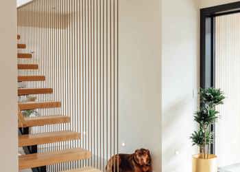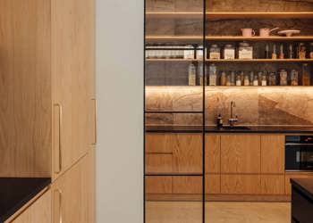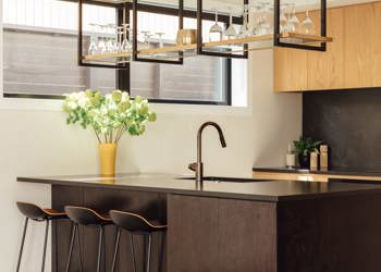 Interior detailing continues the modernist aesthetic. An open-tread suspended timber staircase floats in the entry foyer. Concrete floors, black-framed glazing and white walls feature in the main living areas. Appliances in the kitchen are integrated behind American oak cabinetry. A butler’s pantry lives up to its utilitarian nature with a morning prep station of toaster, jug and blender on one side, and a wine and cocktail making station on the other.