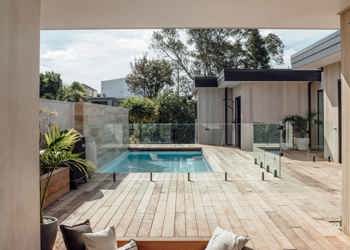 Backing onto a bush reserve, the home makes the most of its lush setting by incorporating a stunning courtyard off the living area. Native bush and a travertine wall form a dramatic backdrop to the pool, with aquila decking running to a sunken outdoor living room, complete with fireplace and skylights - creating the perfect social focal point for year-round relaxing and entertaining.