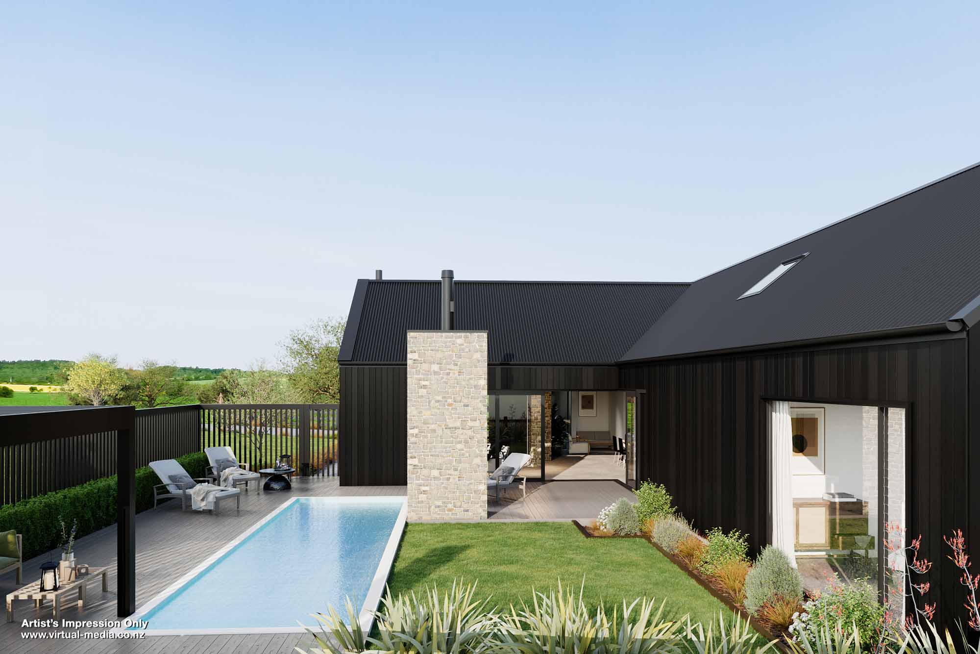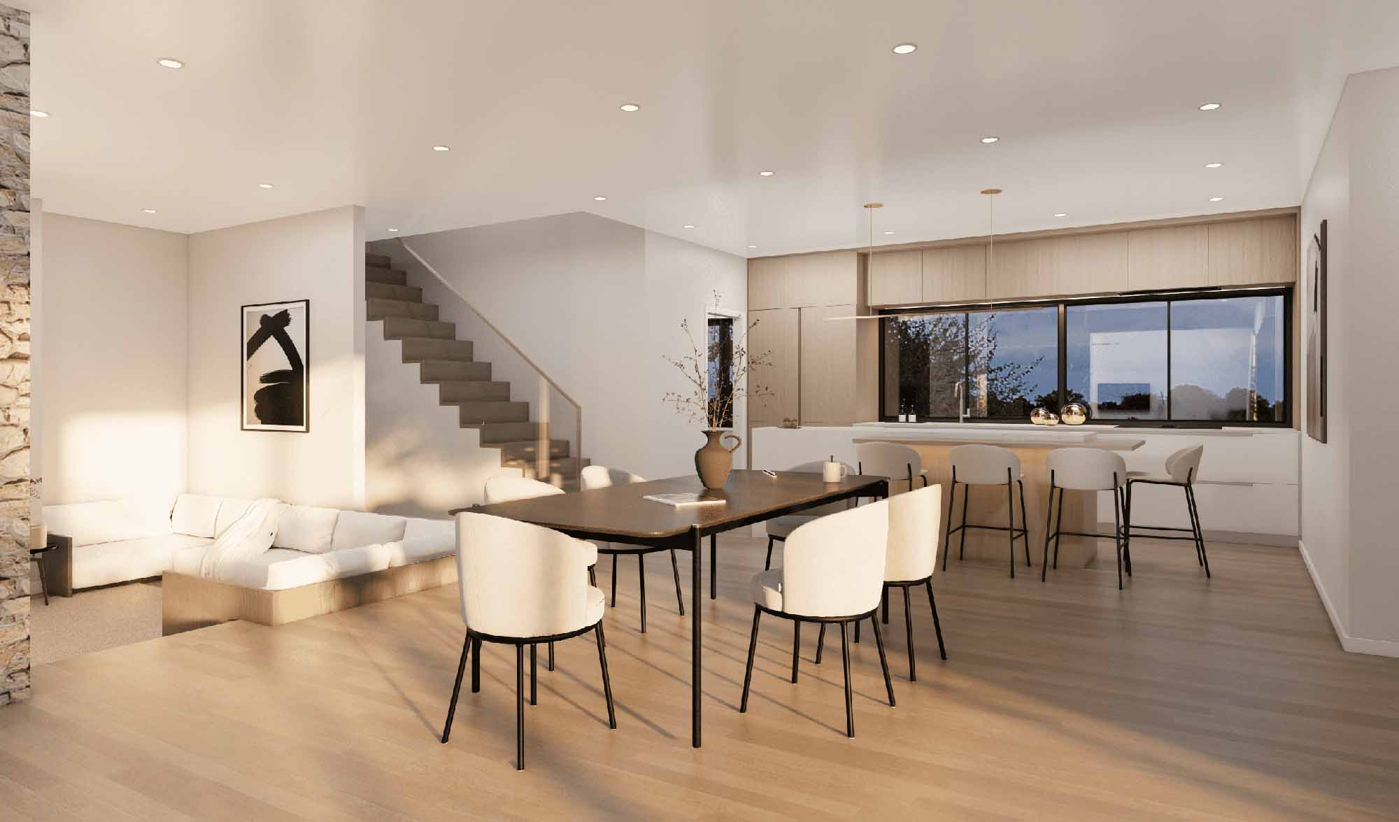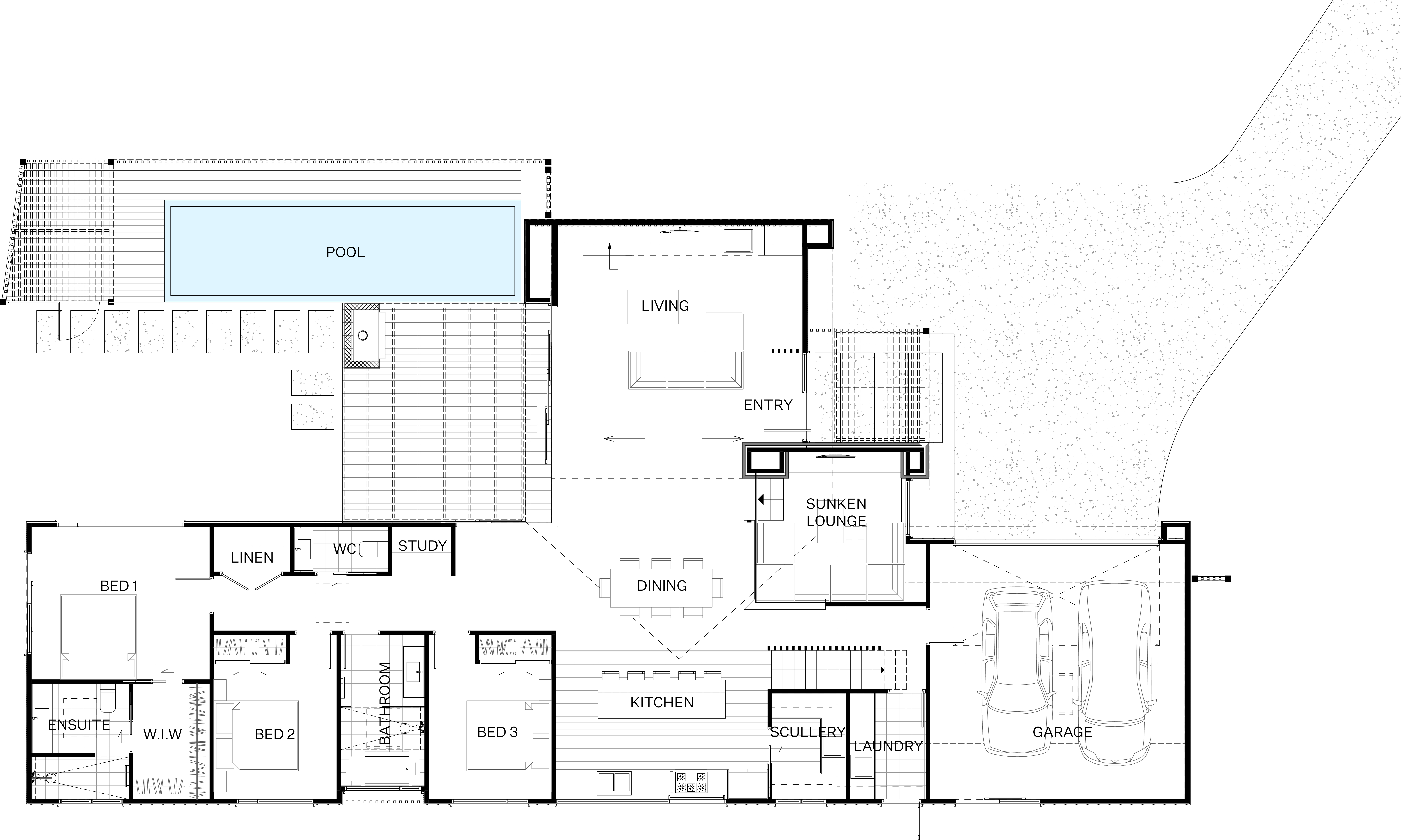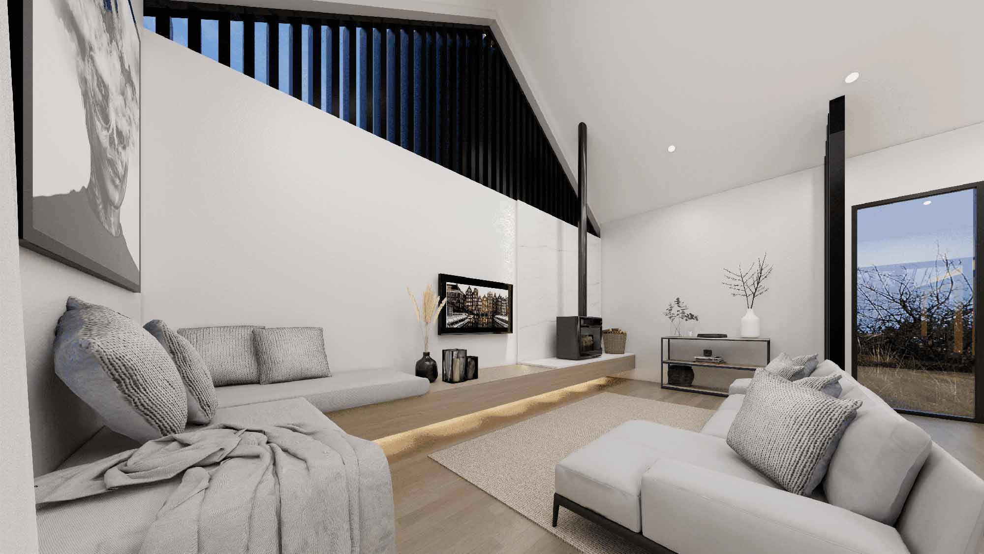 At the heart of the home, a stunning open plan living area sits beneath a dramatic raking ceiling, creating a sense of light, space and connection. A beautifully designed sunken lounge provides the perfect place to entertain guests or relax with family beside the fire.