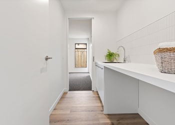 — Separate laundry, custom designed with bench space and tiled splashback